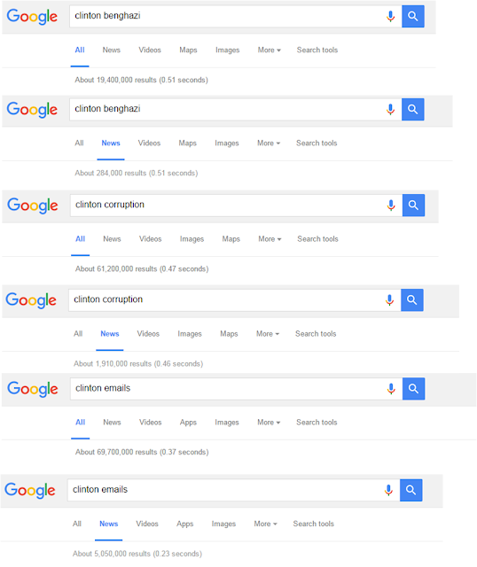 Alguns dos nossos leitores sugeriram que se tinha dado pouca cobertura mediática às falhas dos Clinton em comparação com as falhas de Donald Trump. Decidi fazer uma pequena experiência que, apesar de não-científica, indica que há bastante cobertura mediática de ambos.