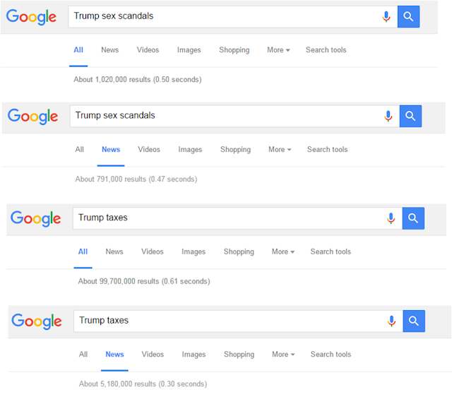 Fui ao Google e meti algumas palavras chave acerca de tópicos mais controversos associados com Clinton e Trump. Apenas vi o número total, não fiz nenhuma triagem por período específico, mas se estão interessados em perder mais algum tempo do que eu, podem pedir ao Google para apenas procurar num período de tempo específico. Fiz estas buscas entre as 20:00 e as 20:30 horas de Houston, do dia 18 (02:00 e 02:30 de Lisboa, do dia 19). Fiz buscas gerais e buscas dentro do subgrupo notícias. Note-se que é impossível saber se todos os resultados são a favor ou contra os candidatos, apenas podemos ver que tiveram tracção na Internet.
